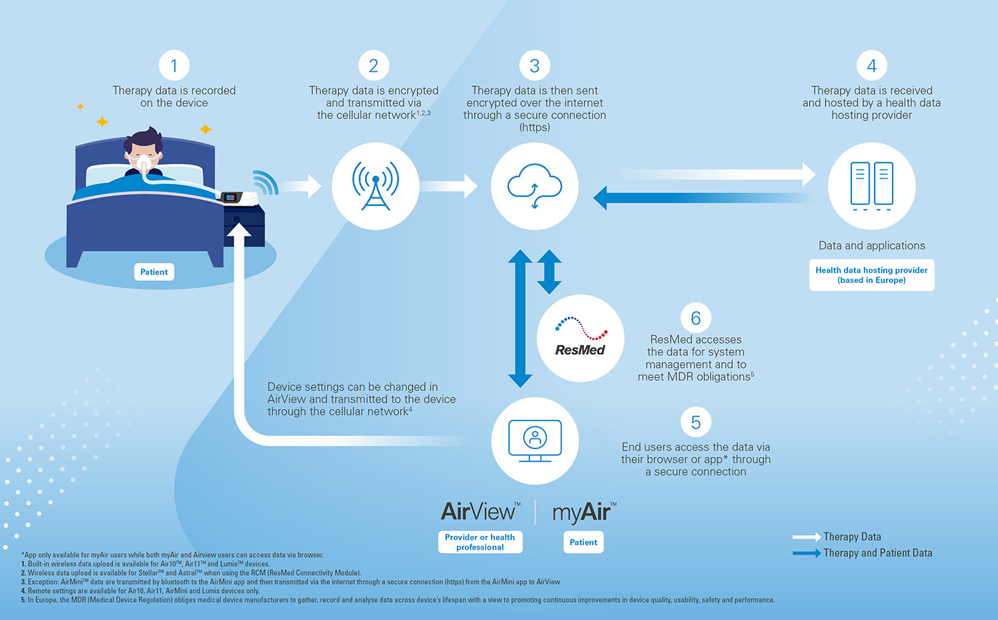 Your patient health data can also help you to enjoy a better quality of care. AirView, Resmed’s telemonitoring solution, allows your care provider to access and interpret health data from your therapy device, adjust your device settings* and troubleshoot issues that arise. If they identify an issue, they can make sure you get the appropriate treatment and support rapidly.