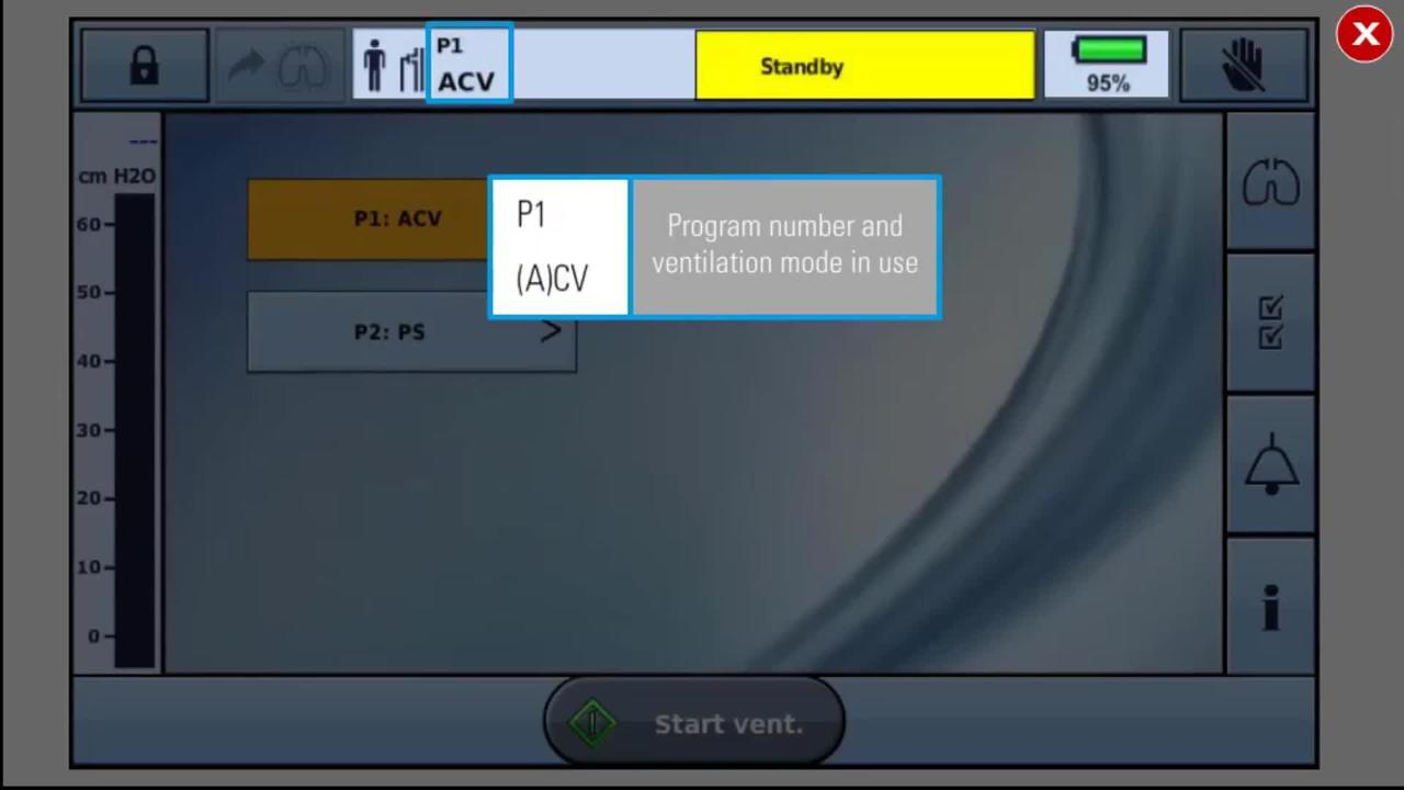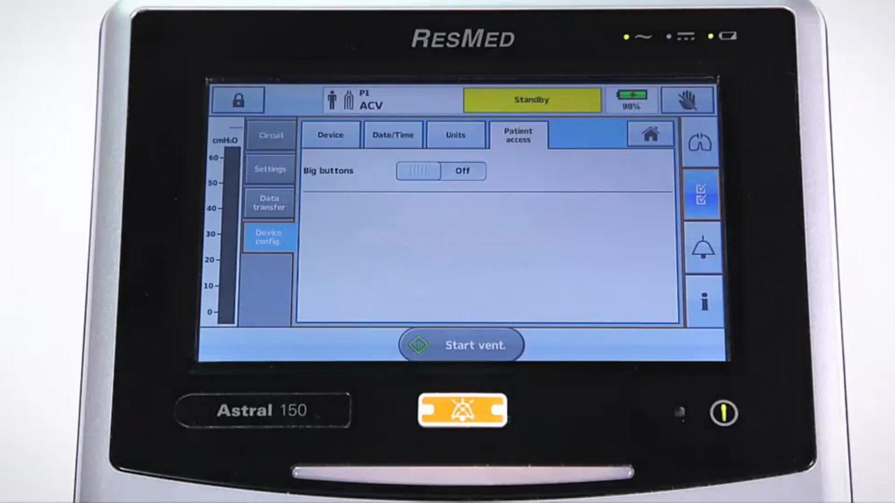 Astral features fixed and adjustable alarms, including an advanced disconnection alarm designed to offer added reassurance. With the optional Remote Alarm II you can stay connected to remote or hospital alarm management systems. A big-button feature on the main display allows you to start or stop the ventilator, or mute the alarm, simply by touching the screen.