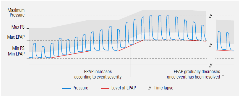 AutoEPAP* automatically adjusts expiratory positive airway pressure (EPAP) to maintain an open upper airway. It is designed to prevent full and partial obstructions from occurring and automatically adjusts expiratory pressure settings to address any obstructions that do occur.