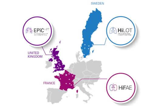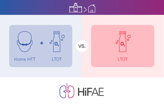 HiFAE (home high-flow therapy with oxygen to reduce acute exacerbations of COPD) is a randomised, controlled trial to evaluate the efficacy of home high-flow therapy with oxygen versus standard oxygen therapy in patients with COPD. This ongoing study is being conducted at 18 centres in France (N=406). The primary endpoint is the time to first hospital admission for AECOPD or death.