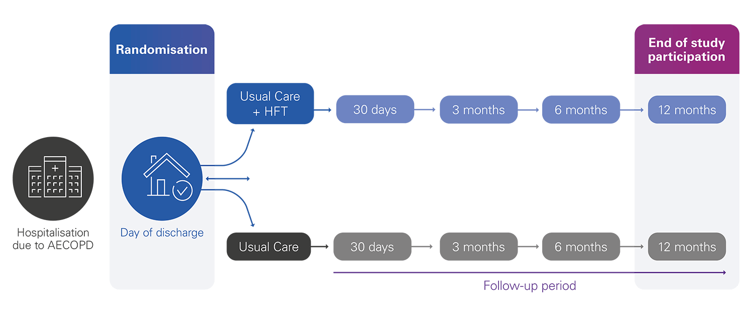 The main objective of the trial is to investigate whether home HFT improves 12-month admission-free survival times, following a severe exacerbation of COPD requiring hospitalisation.