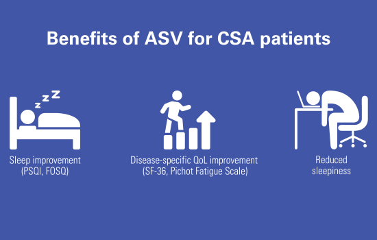 Real-world data from the registries6-8 confirm that ASV therapy is safe and beneficial for quality of life and quality of sleep in the most prevalent phenotypes of symptomatic CSA and TE-CSA and combined OSA/CSA patients. In addition, major benefits were also reported in patients with combined heart failure with preserved LVEF>45% and CSA.6,7