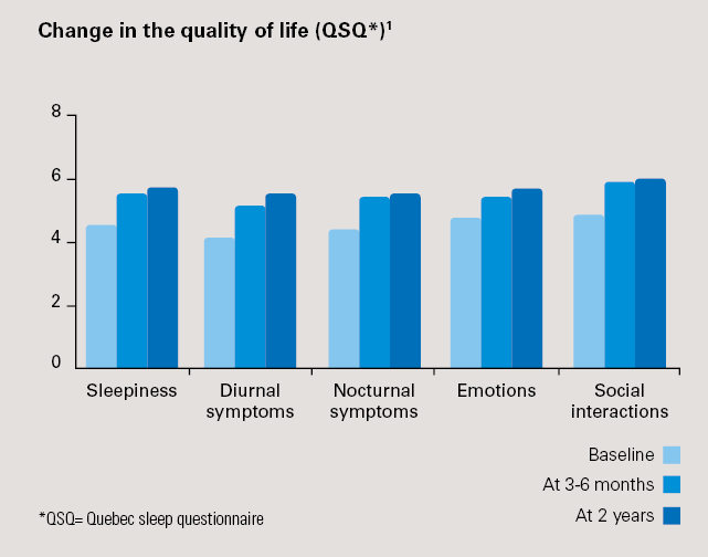Significant improvement in quality of life: +24% increase in the Quebec sleep questionnaire (p<0.0001) after 3 months, which continues to improve after 2 years: +29% increase in the Quebec questionnaire after 2 years (p<0.0001).
