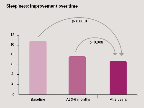Sleepiness reduction: also improving over time. 3.4 points of reduction in the Epworth score (p<0.0001). 62% of patients with an initial Epworth score > 10 were no longer sleepy at 2-year follow-up.