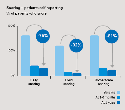 • Patient self-reported data show the disappearance of bothersome snoring in more than 80% of patients after 3 months, with results maintained after 2 years (p<0.0001)