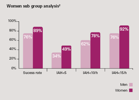 • In women: Whatever the baseline severity of OSA, efficacy at the 3-month follow-up is higher compared to men.4
